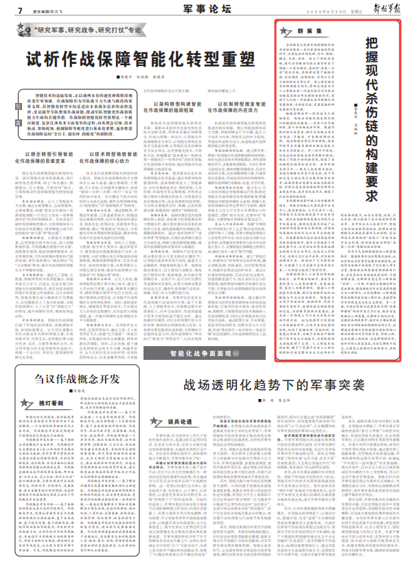 掌握现代连锁杀戮的建设要求■李chengqiao ma yaya杀戮链是一系列紧密连接的战斗联系,从发现目标到破坏目标和影响的分析,主要包括目标发现,定位,监测,阻力,战斗,战斗和评估。与传统的谋杀连锁店相比,现代连锁的发展的主要目的是产生更准确,更有效的“决策”闭环系统,其规律性被整合到链接结构,杀死模块,指挥和控制以及动作模式的深度变化中。深入研究现代链条杀人的建设和演变,特别是关注人工智能的重要作用以及新一代的传播技术在实现链条杀害的杀戮方面,这将帮助人们了解战斗模式的发展,并为指控的研究和开发提供可靠的基础以及武器和设备系统。链接结构已从单个线性变为多元网络。传统的链杀结构是连续进行的脆弱线性链。当特定的链接被阻塞时,整个链链会干扰。随着战斗环境变得复杂,现代的连锁杀戮正在带有网状,多路径,再次配置了弹性结构。通过开发共享的战斗网络,每个战斗节点具有更强的连贯性和独立的战斗功能。当单个链接被中断时,信息和任务的流动可能会自动化,如果我找到替代路径,确保战斗行动的继续,并改善谋杀链的破坏性抵抗和灵活性。在外国军事训练的时代,无人机发现目标后,其沟通链接突然被打扰并失败了。由于目标信息通过战术侧网络实时共享,因此侦察车可以自动恢复目标,并将信息直接转发给附近的直升机,以超过原始失败的节点,从而确保罢工操作的继续。杀戮模块已从集中的独立性转变为分散的协调。传统的谋杀链以大型武器平台为中心,与火力的情境意识和打击相结合,而战斗能力的一代取决于武器平台本身的性能。现代谋杀链是与战斗平台的独立传感器,并使用信息技术来开发广泛相互关联的传感器和效应器网络,从而实现了战争监控和罢工平台盗窃的实施。传感器捕获信息后,它将通过高速网络实时发送给射击者。射手不再依附于传统武器平台,而是选择根据任务需求,包括没有平台战斗,消防罢工平台等的适当消防罢工单位,以执行准确的目标罢工。它不仅可以确保火力损坏的效率,而且还隐藏了其自己的武器平台的特定位置,这些武器在一定程度上发挥了保护作用。命令和控制从手动决策转变为明智的加强。在早期的谋杀链中,每个链接主要依赖于手动决策和运作,决策速度很慢,容易发生人为因素。随着人工智能技术的发展,随着人工智能和半自主控制的加强,现代杀手链开始改变。智能技术应用于目标身份,威胁分析,战斗计划制定和其他链接。它可以快速处理战场上的大量信息,为指挥官提供决策建议,甚至独立地使DE在一定程度上进行决策和控制战斗行动。对AI和机机的研究与所有链条链路以及半自动武器的出现深入融合,这些武器可以加速数据处理和目标识别,决策和建议是很好的,并使系统能够在严格的政策下采取行动,从而提供了支持战争领域的主动性。人工智能系统的出现提供了一个武器平台,即在制造目标政策和目标范围内独立完成某些战斗活动的能力,例如独立的重新认识,身份证明和目标,极大地提高了响应速度和战斗的效率。在外国军事反UAV训练中,获得许可后,智能消防系统可以自动订购激光或微波武器,以对符合contac的“低,缓慢和小”目标进行半自治的拦截T政策,压缩传统的“决策”周期,该周期需要几分钟才能达到第二级。行动方式已从身体破坏变为心理限制。随着战争的形式朝着情报发展,认知空间成为了军事对抗和比赛的新战场,这使连锁店杀死并摧毁了敌人的基本战斗,但更加关注焦虑和恐慌,与命令和决策互动,并打破敌人的意愿。一方面,通过显着分析数据并减少算法,我们可以准确地获得对手心理层面的思维方式和弱点,以及通过不相互互动的方法(例如操纵信息和心理限制)的详细罢工,这些方法直接影响对手的战斗和公众支持。另一方面,可以通过智能武器系统,伴随着信息和心理破坏的欺骗,并失去了敌人对战斗的信念。在最近的当地战争中,双方都采用了战场上的罢工和在线公众舆论战争的结合,试图通过高频实际的战斗威慑行动和网络的心理进攻和防御能力来消灭对手的战斗节奏和战斗心理学,使精神战争产品和对对手的作用变得越来越弱,以使对方的作用变得越来越弱,以至于对对手的作用,以使对方的努力变得越来越弱点,并逐渐陷入困境,并使对方陷入困境,并使对手陷入困境对手的战争潜力从静脉中潜力,并占据了战场倡议。