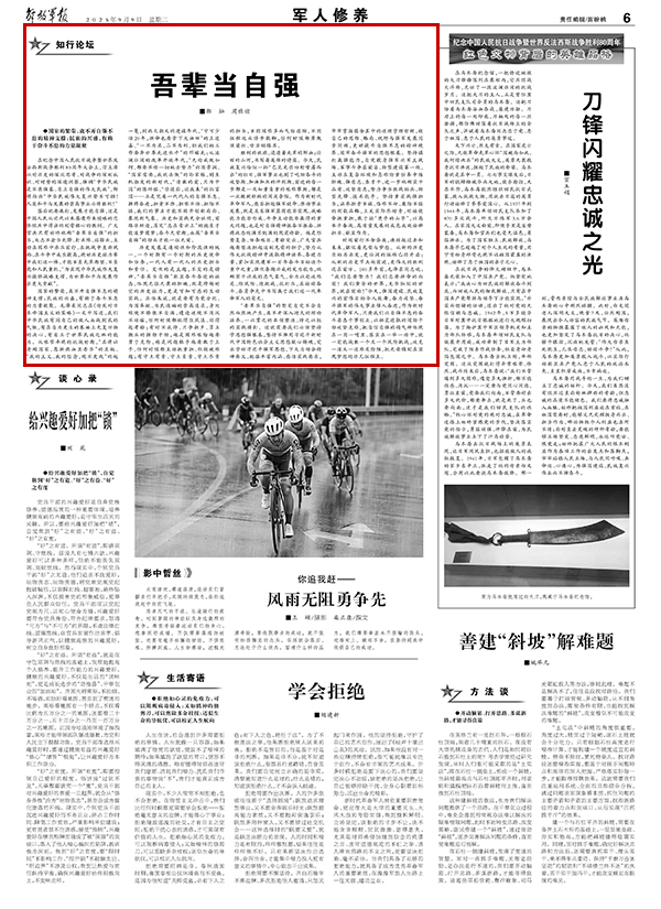 我们必须是自我的■郭可以周居●国家的繁荣不能与自我改善的精神支持分开;该国的发展取决于在纪念中国人民对日本入侵和世界反法西斯主义世界战争的胜利纪念80周年的斗争中无尽的斗争实力。 XI总统强调,历史上有一个深刻的思想,对战争的深刻理解以及对当前状况的深刻看法:“中国国家是一个不怕暴力和自负的国家”,并且显然,清楚地教导说,“对中国国家的巨大刺激是无法控制的,如果您跌倒,您必须击败,您必须胜过这一过程,这是一个自我启发的经验。外国入侵自现代以来,只有始终加强发品委员会“不谨慎地成为先驱者,领导和站在先锋队中,主动采取了倡议,以促进中国国家的困难,面对风和雨水,并为世界和平与发展做出更多贡献。一个国家的发展取决于斗争无尽力量的凝结。毛泽东同志在他的文章“反对日本帝国主义的战略中”写道,我们的中国国家有一种基于自力更生的敌人的敌人的精神,以及基于自力更生的能力。从祖夸恩(Zuo Quan),他“著名的将军为国家牺牲了生命,愿意为鲜血而战来捍卫我们的中国”,Zhao Yiman(Zhao Yiman)“我的意识形态和我的信念将永远不会改变”,王Jinxi,他“偏爱20年,努力努力赢得大量的石油领域”和Deng Jiaxian的收入,”和Deng Jiaxian,”l世界上“从陈明伦(Chen Jingrun),“无论是什么成功或失败,我们都必须努力工作”,而太阳的贾东(Sun Jiadong”(Sun Jiadong不惧怕我们的职业,我们的职业可能会继续开放新的环境,并证明,通过确定“雄心勃勃”的野心,我们只能通过努力来实现我们的梦想,而我们始终可以保持自我的发展。活动,每个一代都有历史责任和责任在变化是主题,保持不变的是精神。 “我们必须自我完善”表明了斗争和发展的状态,并反映出无所畏惧的勇气。这不仅是整个时间和空间的历史继电器,而且是可以看到和合理的生动实践。具体来说,我们必须有尊敬的意图分享该党的担忧,对国家的奉献,并使人们受益,而不是在良好的时期吹嘘或自满,而不会在不良时期沮丧或挥舞,并随时承受审判;有时我们不会被注意到,占据太阳,并站在努力的艰难位置是,越难,您应该越多地克服风险。问题越难,您就越需要入门。在任何时候,您都应该主动承担沉重的责任并积极解决问题。您必须有责任对自己的领土负责,对您的领土负责,并将您的责任纳入您的责任。不要因为许多困难而失去希望和撤退,不要因为漫长的旅程而停下来休息,并勇敢地成为支柱,并准备随时成为铺路石。成功的旗帜被祖先的血液浸透了。令人惊叹的山脉和河流写英雄的诗。如今,民族生活的变化就像是“越来越明亮”的红色日子。军事加强的原因也达到了一个艰难的斗争和一段艰苦工作的关键时期。向前迈进的每一步都是艰难的攀登,可以带来沉重的负担,以及障碍和障碍的成功。作为新时代的革命士兵,如果他能够承担军事加强任务并促进事业的发展,不仅是罪魁祸首,如果可以实现军事加强计划,那就成为一个现实的能力斗争是否充满。局势越复杂,艰巨的任务和审判是,官员和士兵必须确保辉煌的负担是克服困难,避免风险,面对挑战并防止压制的最大负担,并写下了我们一代革命性士兵的荣耀,并为正在进行的斗争和勇敢的斗争而奋斗。对“我们应该自我改善”的稳定意识并不自然而然,并且不能与深层和长期的理论喂养,持续的形成和持续的实践冲突中分离出来。它要求我们连续探索思想来加强基础,在使用新时代的社会主义的习惯上毅力,以统一我们的心和灵魂,以强调习近平的研究,以思考军事力量,以善于理解富人的精神,以了解富人的精神,以了解富人的精神性,以了解富人的精神性,了解富人的精神性,了解军事力量d理解富人,理解富人,理解有钱人,理解有钱人,理解富人,理解富人和理解富人和可理解的富人,并理解富人和理解富人和可理解的富人。因此,有必要在其中严格理解原则,理论和哲学,并与强大军事的发展同步,更好地改善了自我完善的精神王国,并结合了努力工作以加强军队的意识形态基础。我们将继续努力赢得和增强自己的能力,有意识地致力于加强军队的主要战场,军事斗争的前沿以及转型和建设的前线,采取主动性培养勇气,增强我们的意志,并增强我们在复杂的环境中,紧急,困难和危险的任务,进一步增强我们的能力并将克服困难,并努力成为胜利的榜样,Pusirtirati,Pulaniratirat,《变革》和技术专家。遵循专注于培训和加强责任的原则,培养失去责任的稳定特征,在面临困难时不承担风险,不害怕危险,以真理的依据,履行责任,与我们的行为相一致,并敢于承担“哈特马土豆”,这种水平和较高的替代方案。时光呈现日夜,将过去和未来联系起来,记住荣耀和梦想。从历史上的新坐标开始,开始了一次美好的旅程。从新的历史节点前进,取得了更大的成功。 100多年前,毛泽东同志说:“我们一直在努力工作!我们一直在前进!我们的黄金世界和辉煌的世界在我们面前!”今天,良好的目标oF建立强大的国家和民族刺激令人鼓舞,我们努力克服困难并努力为力量而努力。军队的好事业令人鼓舞。就像新时代的革命士兵一样,只要我们努力建立自我改善并努力克服开拓和繁殖精神的困难,让我们包括我们在每个帖子和每一个运动中都提高自己的自信心,我们一定会克服一个风险和又一个风险,又能挑战一个又一次的困难,又一次地赢得了越来越