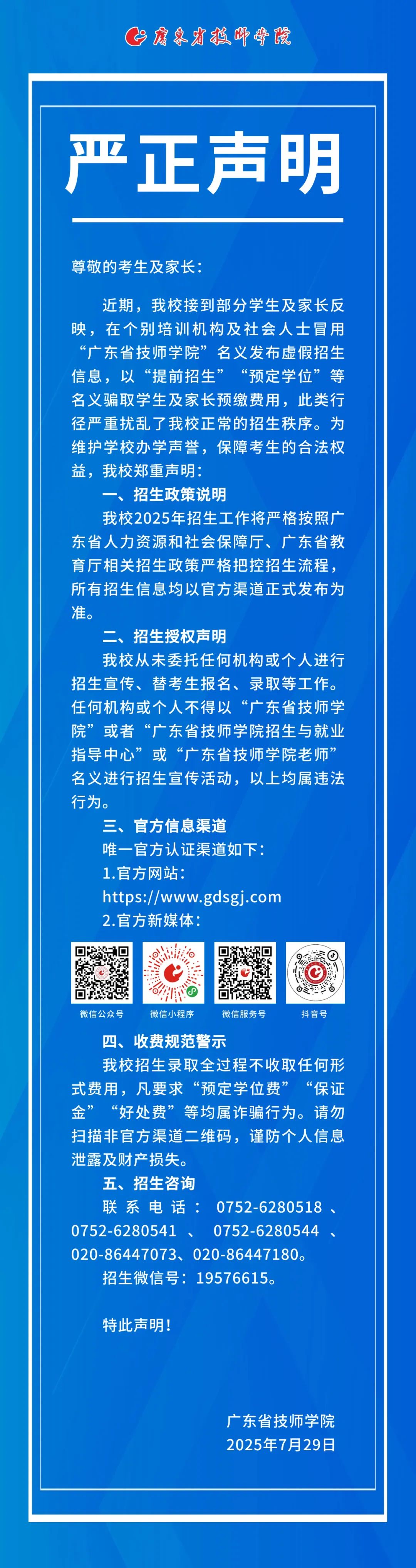 7月29日,广东技术人员学院发表了一份庄严的声明,说最近,广东技术人员学院收到了几位学生和父母的报告,称一些培训机构和社会上的人使用“广东技术员学院”的名字,以“高级注册”和“保留学位”的名义获得预付款费用。这种行为严重干扰了正常术语 - 遵循广东技术人员学院的注册表。根据声明,2025年在广东技术人员学院入学的工作将严格根据广东省人力资源和社会保障局以及广东省教育部的规定控制注册过程。注册表的所有信息应受到官方渠道的正式发布。广东技术人员学院说,广东技术人员学院从未委托任何机构或个人在注册中进行宣传在,注册,进入和其他活动。没有机构或个人可以以“广东技术人员学院”或“广东技术人员学院招生和就业指导中心”或“广东技术人员大学老师”的名义进行宣传活动。以上所有都是非法行为。广东技术人员学院提醒您,整个广东技术人员学院流程中的任何形式的费用都无费。对“保留学位费”,“安全”和“福利”费的任何要求都是欺诈。请不要 - 扫描非正式的QR频道码,以避免个人泄漏信息和拥有的损失。南部网络,广东研究记者李·吉机械