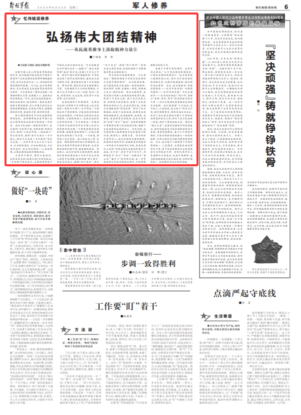 促进团结的伟大精神 - 从战争战争的英雄中汲取精神力量。在中国共产党的领导下,我们将强烈感受到整个国家对敌人的团结和抵抗的力量,这将对整个国家的团结精神感到惊讶。可以说,与日本战争的成功是整个国家的巨大成功,在一场勇敢的战斗中团结起来。习近平教导:“统一是克服所有困难和重要保证的强大力量,可以统一人们的心并取得巨大的成就。”现在,让我们纪念与日本斗争的战争的成功。重要的事情之一是Grea的进步统一的精神,发展统一的力量,未来的力量,并赢得全国现代化刺激的主要刺激原因。团结的伟大精神是中国国家精神的独特象征。在中国战争反对日本入侵的战争中,进一步显示了这种精神徽标。 Under the Anti-Japanese National United Front call, we see the cooperation of "brothers and sisters who fight against the wall and defend against their insults outside", mobilizing the whole country through "workers, farmers, soldiers, learners, businessmen, and business, and save the country", and the full support of "the artillery cannot stop one day,T their grain on their backs responsibility, regardless of class, party, ethnic, or domestic and abroad, men, women, children and成年人和曼联一起去国家危机,在抵抗战争中以统一的铁流聚集。D团结只能赢。毛泽东的同伴深入教授“关于旷日持久的战争”:“日本敢于克服我们的主要原因是中国人的贫穷状态。”日本征服者认为,中国是一种“零星的沙子”,然后采用了所谓的“快速决定”计划摧毁中国三个月。面对该国毁灭和种族的激进战争,中国国家取得了团结,刺激了无敌的力量,并最终完全击败了日本征服者。事实证明,统一是克服困难的强大力量。只要中国人超过14亿次思考和共同努力,共同努力并共同努力,没有什么事情,没有什么事情或无法克服的障碍都无关紧要。在党的旗帜下加强团结。毛泽东同志在文章“在反日战争的国家联合阵线中赢得数百万人”的文章中写道:“只有t共产党的统一可以只能实现,整个国家可以击败,民主和民主革命的活动可以完成。核心是脊柱和固定的恒星。一对一 - 努力为该国加强和加强党旗下的军队的原因而努力。通过目标和行动赢得团结。习近平总统指出,“围绕斗争目标的澄清而产生的团结是最稳定的团结”。在与日本的战争中,我们的政党占据了反日国联合阵线的高旗帜,决心受到统一战线的保护,结合和发展,并遵守战斗战争中的独立性和团结。在与额叶战场合作,我们的官员和士兵赢得了pingxingan的胜利,Yanmennguan Ambush,Yangmingbao的胜利和其他勇敢的成功,以与敌人作斗争,这启发了整个国家的道德,团结了战争的战争;发起了一百次战争,摧毁了侵略者的“笼子政策”,捍卫了反日的基础,并反对战争局势。遵守S游击战的战略和战术,采用了灵活的战术,例如袭击战争,隧道战,地雷战和麻雀战争,以与“席卷”,“乡村”和“侵害”的日本和伪军的“清除”和“侵害”,并赢得整个国家的高度信任,并赢得了一个伟大的国家,并赢得了英勇的人民的高度信任,并赢得了伟大的胜利,并赢得了伟大的战争,并赢得了伟大的国家,并赢得了伟大的胜利,并赢得了艰难的努力,并赢得了整个国家的努力,并赢得了整个国家的努力 斗争。历史证明,我们的政党坚持以最聪明的目标和最强大的行动来赢得人们的心,并赢得力量。作为新时代的革命士兵,我们必须对党的呼吁做出回应,积极参与实现军队建立第100个目的的出色技巧,成为“以现代构造风格的“坚定的激进主义者和实践工人”,“在我们各自的位置上,努力,明智地工作,并使用实际的行动,并使用实际的行动来跨越“雪山”,“雪山”,“杂草”,“ue”。在步骤步骤的过程中,我们将继续增强战斗的统一和有效性。斗争的统一性和有效性。王·金威(Wang Jingwei)的叛国罪和向敌人投降,房屋的统一是危险的。国内团结的整合 - 反对内部分裂!试图为国家发展发展 - 向后! ”,遵循“理性,盈利和严格”的原则,并更新由kuomint发起的反社区的高潮,然后再次。如果有人不伤害我,我们的政党遵循自卫,我不会伤害其他人;如果一个人没有伤害我,我会伤害另一个人。Dom和坚定的战斗争取团结,捍卫反日国联合阵线,并保持团结和抵抗战争的总体状况。发展和发展。面对对大风,急流甚至风暴浪潮的基本测试,仅仅通过迫使团结和大胆地通过斗争维持统一,我们就可以为人们提供重要的保证,以克服事先在道路上的所有风险和挑战,并继续从成功转变为成功。今天,我们每个人都必须为国家团结,人民的团结以及该国所有种族的团结而勇敢地战斗,并决心与威胁到国家安全的思想和行为作斗争。新时代的革命士兵应该加强他们的斗争精神,提高斗争精神,努力提高胜利和胜利的能力,并为维护民族团结和民族团结做出适当的贡献。